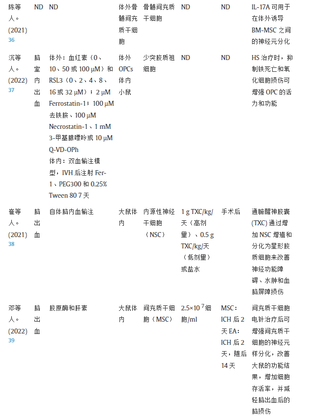 表1:該表舉例說明了有關使用干細胞治療出血性中風的研究。(ND=未描述)。