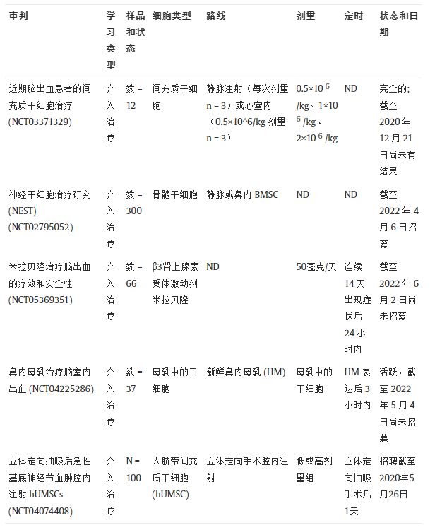 表2:該表舉例說明了2020年至2022年期間通過在ClinicalTrials.gov上搜索“出血性中風”或“ICH”或“腦出血”和“干細胞”找到的臨床試驗更新。(ND=未描述)。