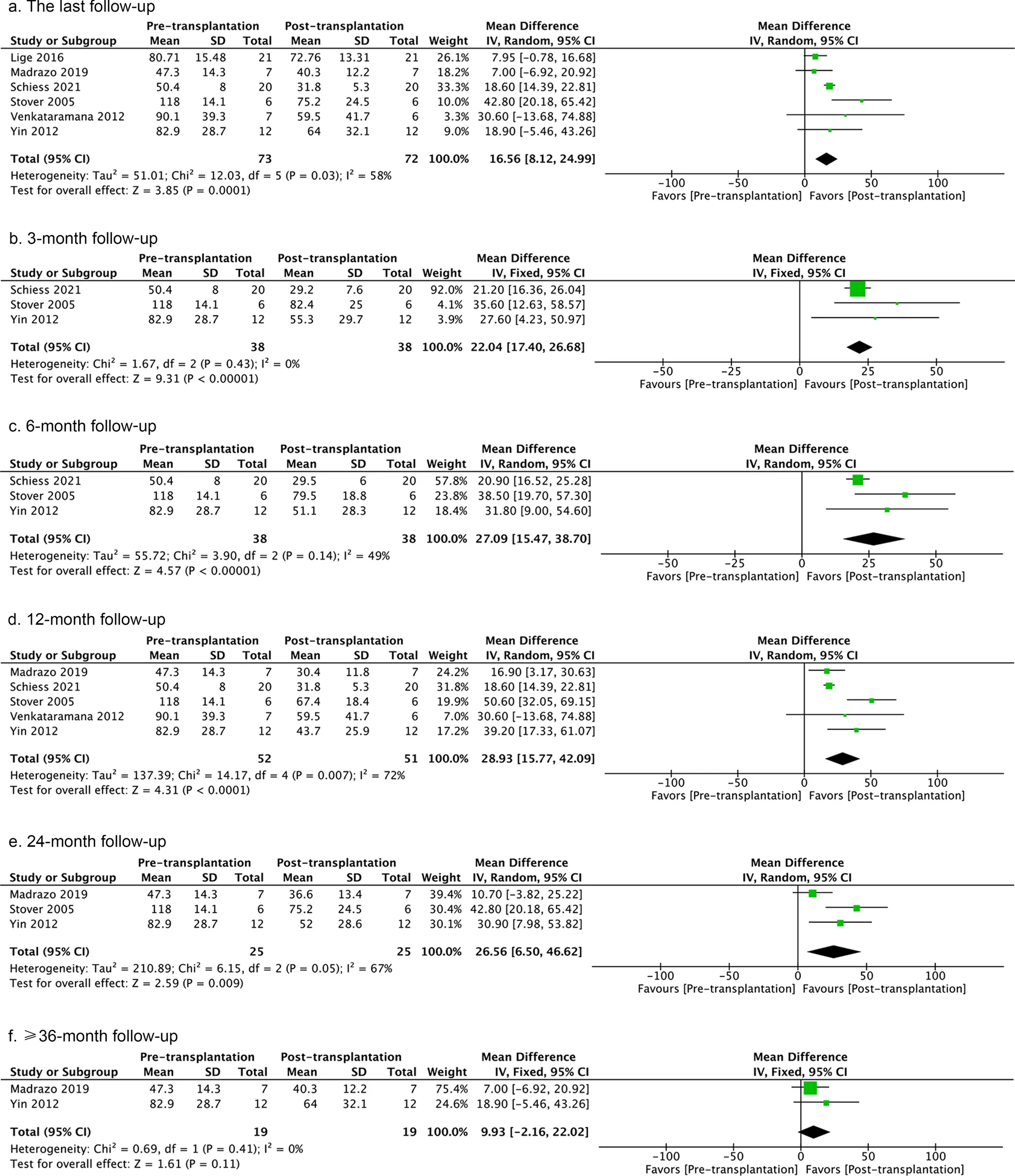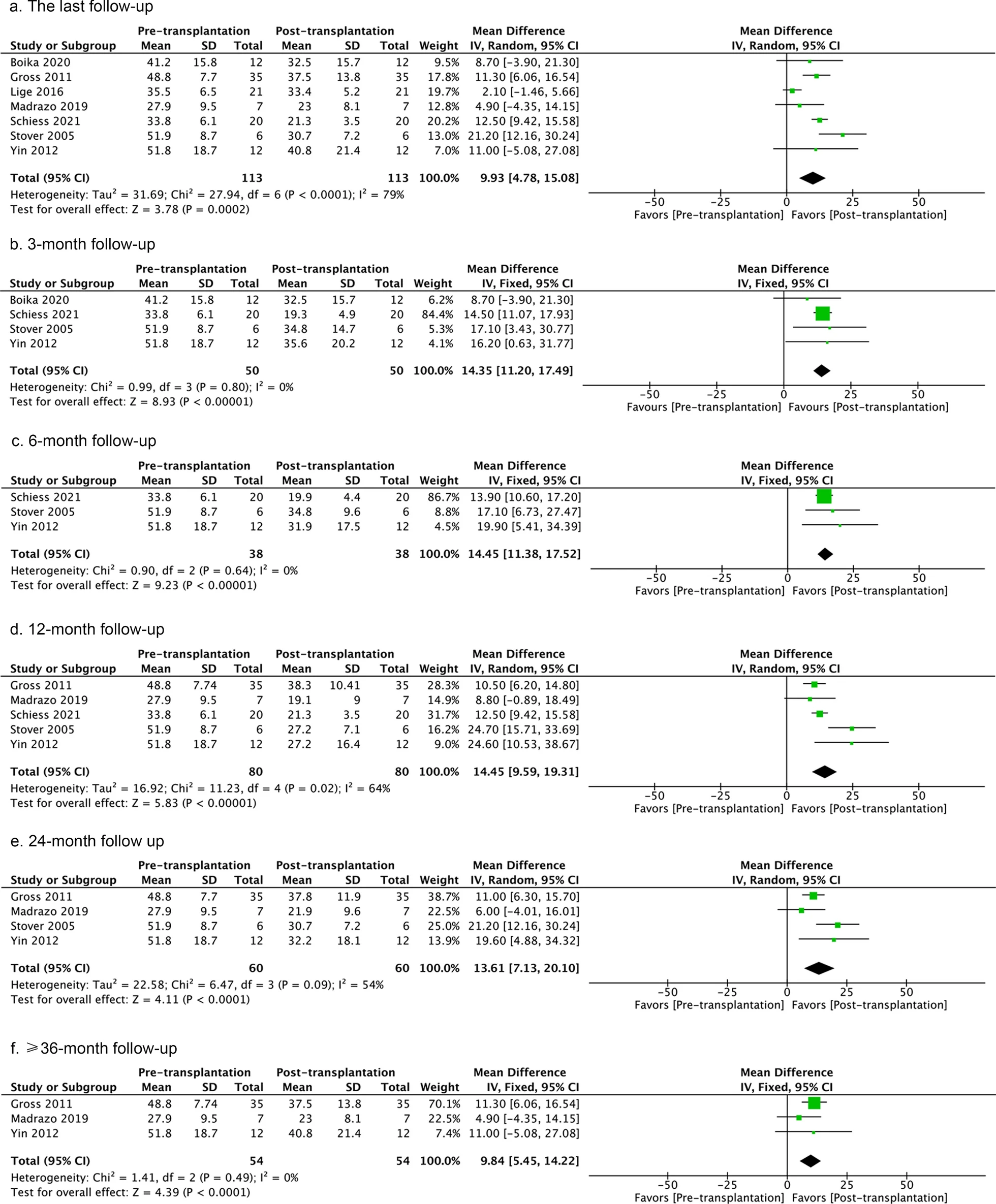 薈萃分析顯示,治療后與治療前相比,總體功能更好,但異質性也很明顯。在最后一次隨訪以及3、6、12和24個月的隨訪中,同種細胞療法對 “關閉 “狀態下的UPDRS評分產生了有益的影響,但在≥36個月的隨訪中沒有這種影響(圖2)。然而,只有兩項研究報告了后者(圖2)。在3個月、6個月和≥36個月的隨訪分析中,”關閉 “狀態下的UPDRS評分顯示出相對的同質性(圖2)。此外,細胞治療改善了12個月隨訪時 “開啟 “狀態下的UPDRS評分,但沒有改善最后一次隨訪或24個月、≥36個月隨訪時的評分(附加文件2:圖S2)。在12個月、24個月、≥36個月的隨訪中沒有明顯的異質性,但在最后一次隨訪中卻有明顯的異質性。這可能是由于不同的移植范例造成的。