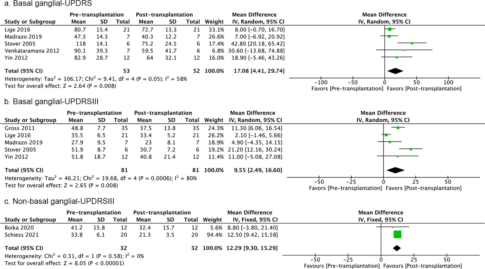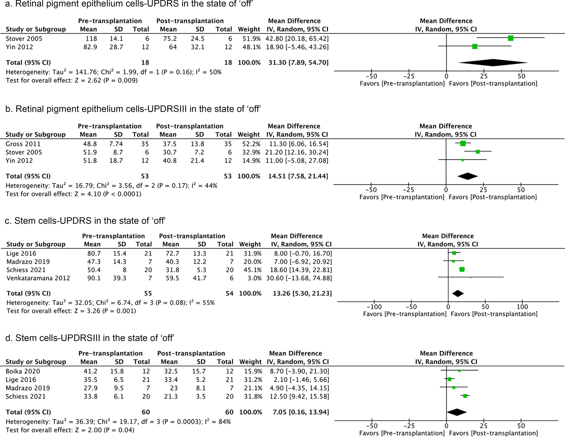 七項研究測量了干細胞療法對運動癥狀的影響。使用隨機效應模型來比較研究最后一次隨訪時“關閉”狀態下治療前與治療后的UPDRSIII評分。細胞處理后薈萃分析得到了更好的結果,但異質性很高(圖3)。