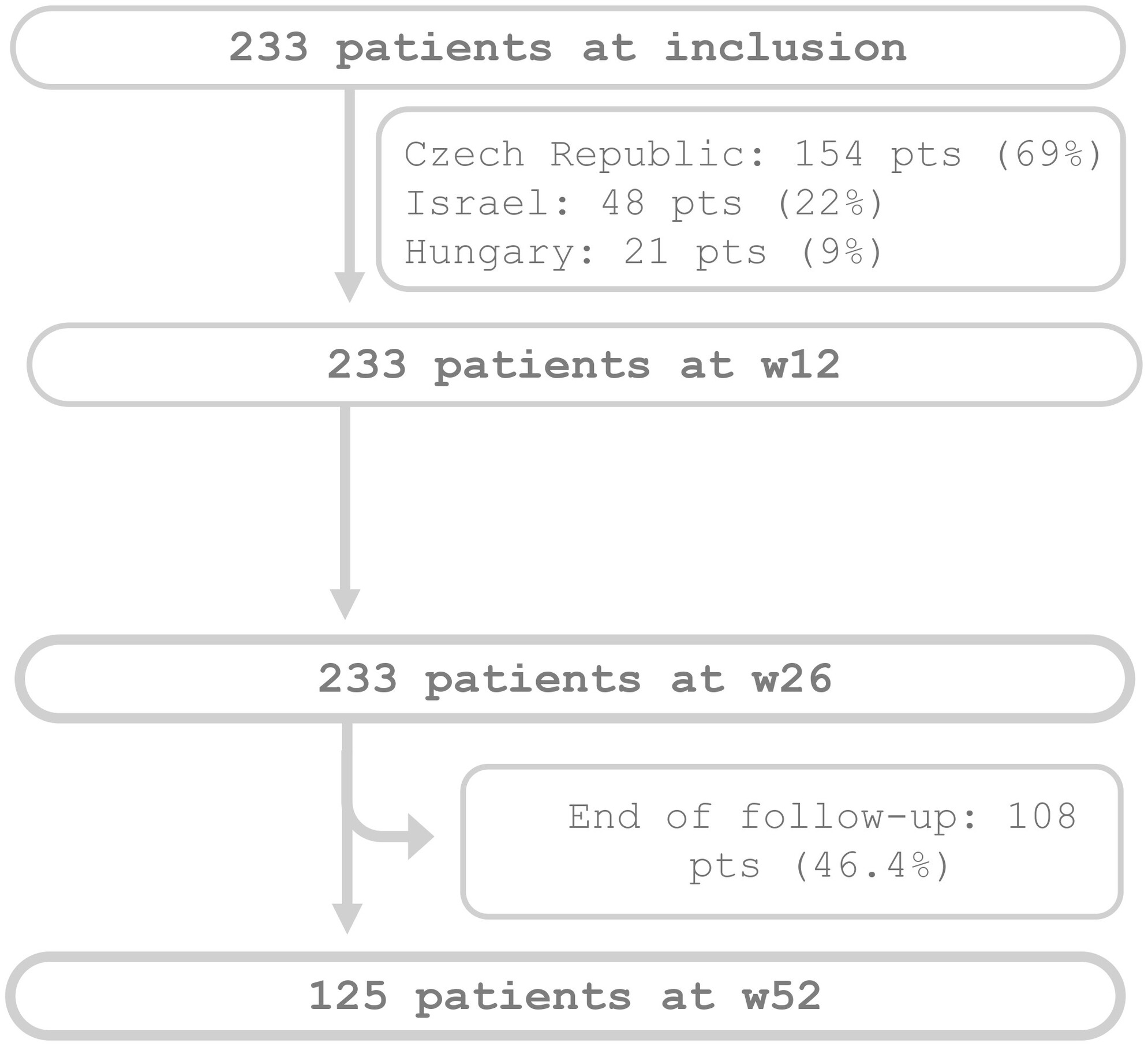 納入時的中位年齡為39歲,患者患CD的中位持續(xù)時間為13年。大約四分之三(75.7%)的患者在納入時不吸煙。總體而言,69.1%的患者在大型三級醫(yī)療中心接受治療。圖1顯示了納入患者的流程圖。