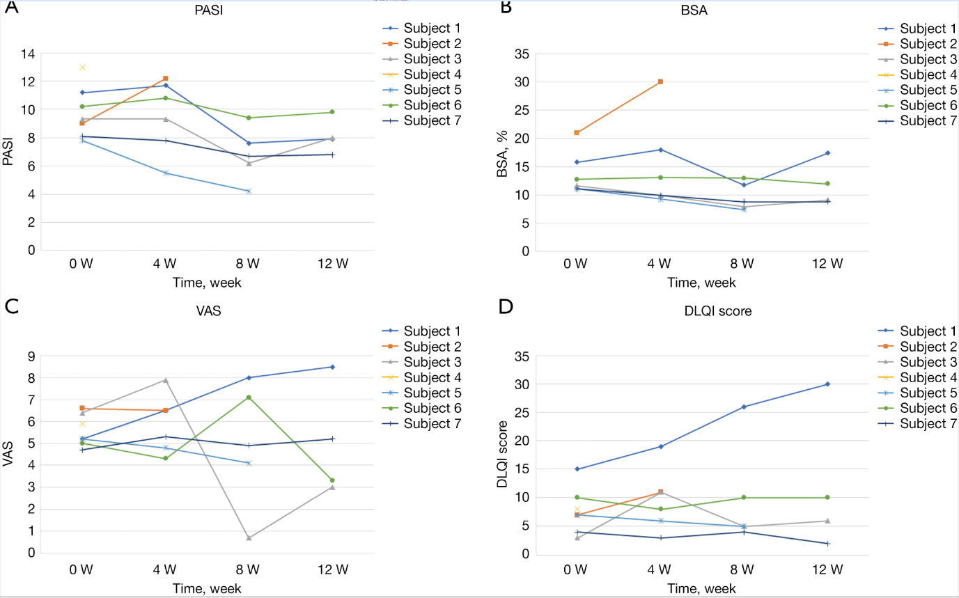 PASI評(píng)分從基線(xiàn)到第12周的改善率范圍為-0.36%至46%。圖2顯示了7名參與者的一些結(jié)果測(cè)量值。PASI 分?jǐn)?shù)從基線(xiàn)到第12周逐漸下降(圖2A)。然而,在基線(xiàn)和第12周之間,PASI、BSA、VAS 和DLQI評(píng)分沒(méi)有統(tǒng)計(jì)學(xué)上的顯著差異(參見(jiàn)圖2B-2D)。在試驗(yàn)過(guò)程中,沒(méi)有參與者達(dá)到PASI-50或PASI-75。