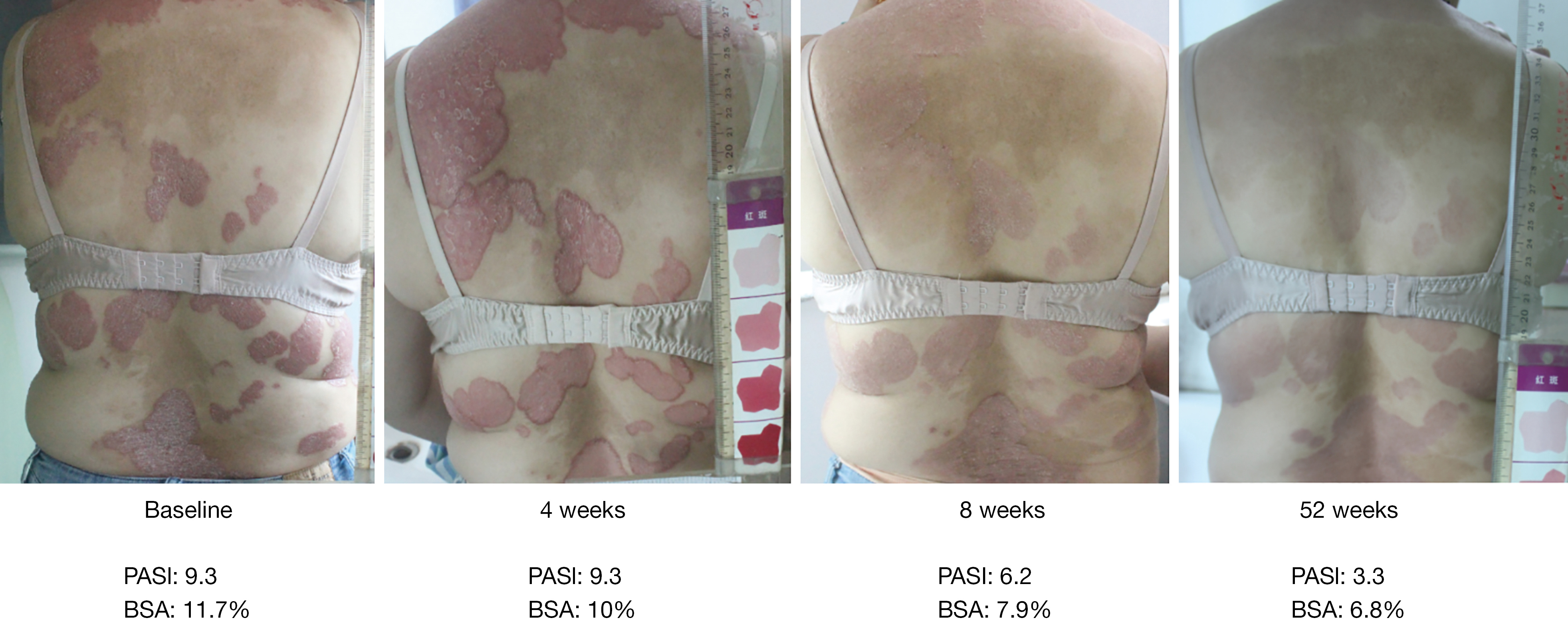 這四張圖片是其中一名參與者在治療前后的皮膚圖像。從圖像上看,治療后病灶的紅斑、脫屑和浸潤(rùn)均有明顯好轉(zhuǎn)。PASI評(píng)分從基線(xiàn)(治療前9.3)到治療后52周(3.3)逐漸下降。BSA也有所下降(從 11.7% 下降到6.8%)。參與者在第52周達(dá)到 PASI-50。BSA,體表面積;PASI、銀屑病面積和嚴(yán)重程度指數(shù)。