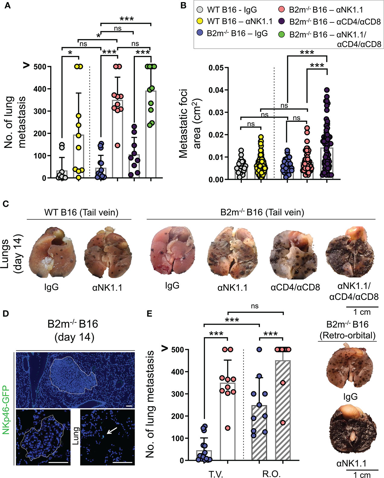 在本項(xiàng)研究中,作者利用B16轉(zhuǎn)移性黑色素瘤模型來(lái)證明NK細(xì)胞如何與T細(xì)胞合作來(lái)減少肺部轉(zhuǎn)移性腫瘤負(fù)擔(dān)。