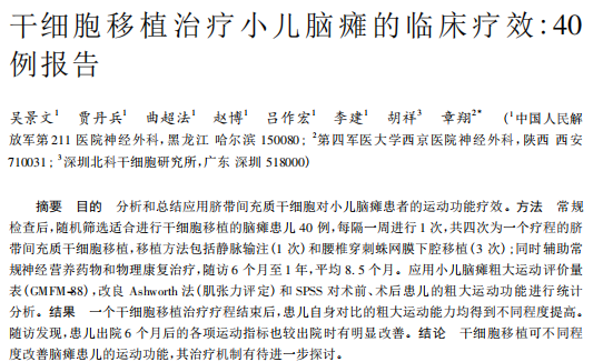 中國人民解放軍第211醫院神經外科團隊[2]對40例腦癱患兒進行臍帶間充質干細胞治療,療程結束后發現,和患兒自身對比的粗大運動能力均得到不同程度提高,尤其是仰臥位與俯臥位、坐位、爬與跪、行走方面,跑跳功能方面也有明顯改善; 而且在患兒出院后6 個月至1 年期間內,仍能維持長期的療效。同時,干細胞移植治療也明顯降低患兒的肌張力。