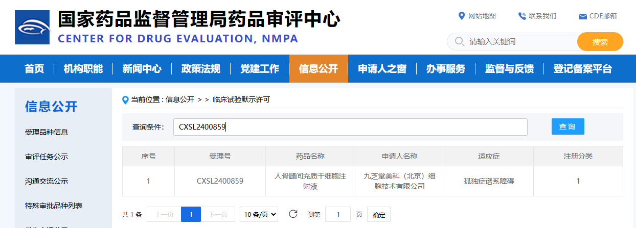 2025年3月11日,國家藥監(jiān)局藥品審評中心(CDE)官網(wǎng)公示,九芝堂美科(北京)細(xì)胞技術(shù)有限公司(簡稱“九芝堂美科”)申報(bào)的“人骨髓間充質(zhì)干細(xì)胞注射液”獲批臨床IND,適應(yīng)癥為“孤獨(dú)癥譜系障礙”。