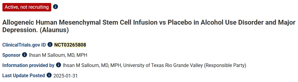 第三項:2025年,美國德克薩斯大學里奧格蘭德河谷分校進行了一項同種異體人間充質干細胞輸注與安慰劑在酒精使用障礙和重度抑郁癥中的療效對比的臨床研究。