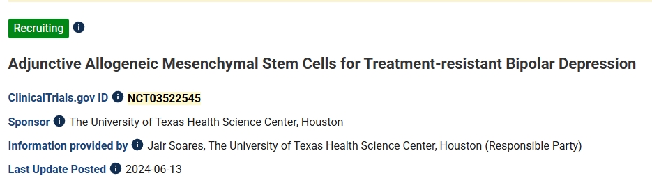 第二項:2024年,美國德克薩斯大學休斯頓健康科學中心開展了一項輔助性異基因間充質干細胞治療難治性雙相抑郁的臨床研究。