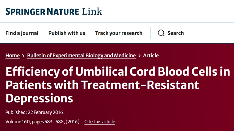 2016年,“實驗生物學和醫學公報”報道了一項“臍帶血細胞對難治性抑郁癥患者的療效”的臨床研究結果。