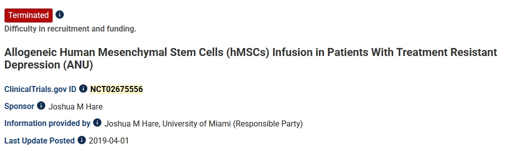 第一項:2019年,澳大利亞國立大學進行了一項異基因人類間充質干細胞(hMSCs)輸注治療難治性抑郁癥患者的臨床試驗。