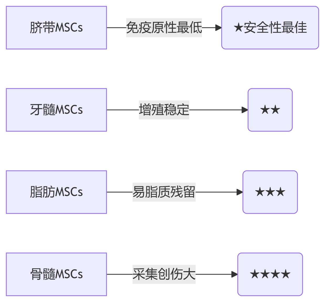 | 腫瘤促進作用 | 分泌VEGF等促瘤因子 | 禁用腫瘤患者,輸注前篩查癌變史 |