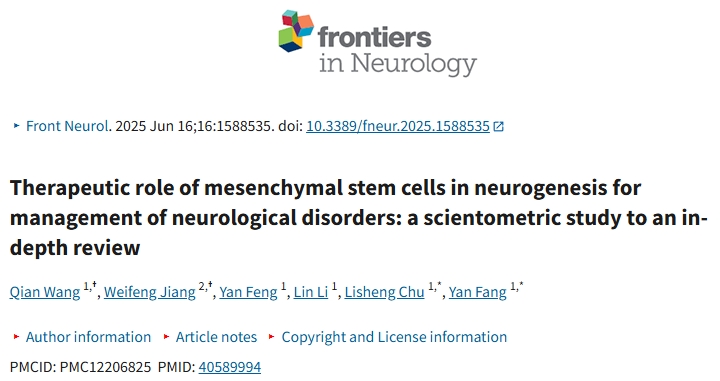 [1]Wang Q, Jiang W, Feng Y, Li L, Chu L, Fang Y. Therapeutic role of mesenchymal stem cells in neurogenesis for management of neurological disorders: a scientometric study to an in-depth review.Front Neurol.2025Jun16;16:1588535.doi: 10.3389/fneur.2025.1588535. PMID: 40589994; PMCID: PMC12206825.