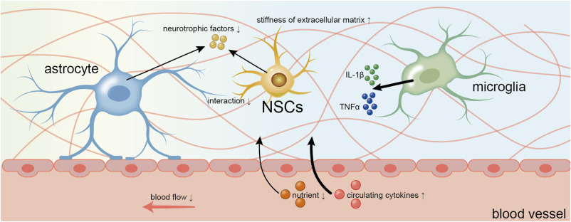 在衰老過程中,星形膠質細胞釋放的神經營養因子減少,與神經干細胞的相互作用減少,而活化的小膠質細胞則釋放更多的促炎細胞因子,例如 IL-1β 和 TNFα。此外,衰老會導致血流量降低和血管通透性改變,這意味著更少的營養物質和更多的循環細胞因子進入神經干細胞微環境。最后,細胞外基質在衰老過程中變得更硬。箭頭的粗細表示強度或嚴重程度。