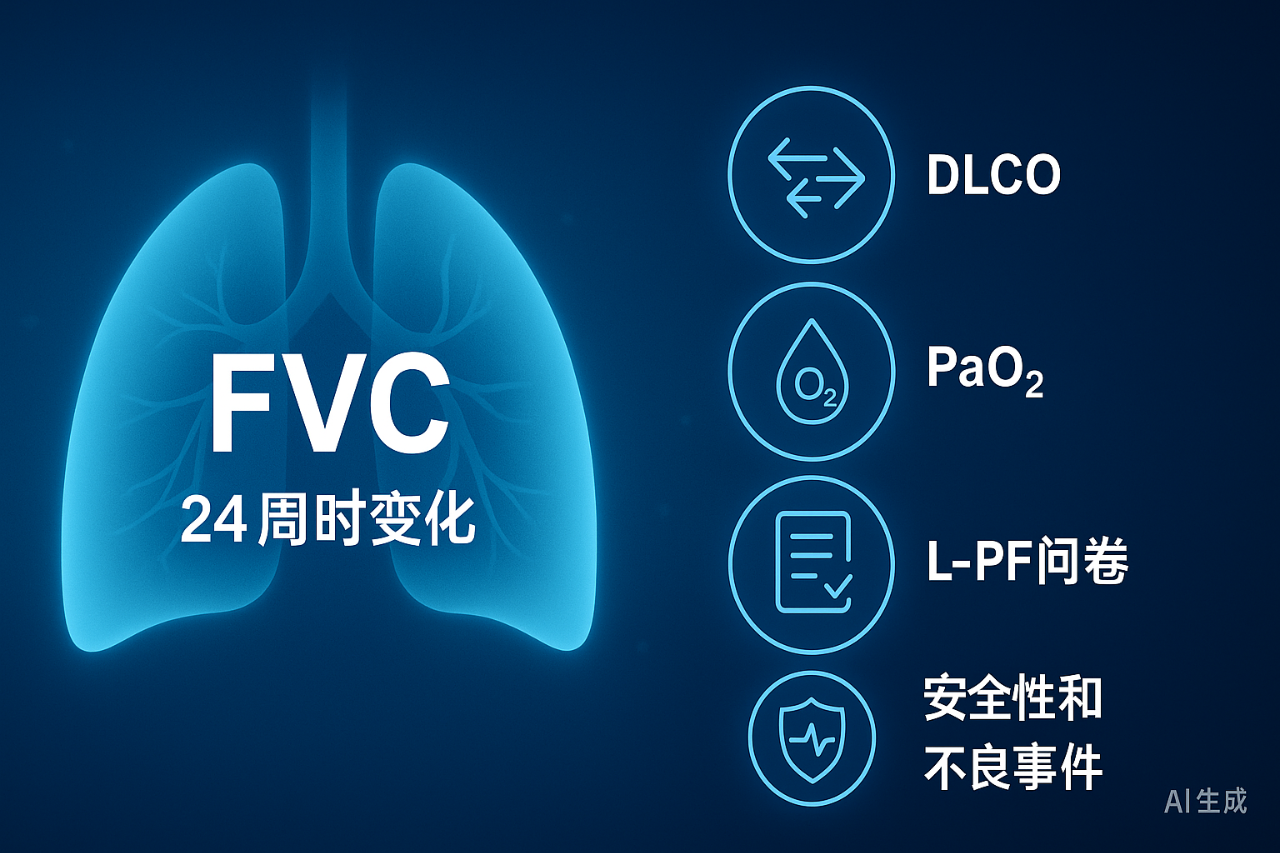 主要觀察指標為24周時FVC(肺活量)的變化,該指標是評估肺容量和纖維化進展的關(guān)鍵依據(jù)。次要終點包括肺彌散功能(DLCO)、動脈血氧分壓(PaO?)、生活質(zhì)量問卷(L-PF Symptoms/Impacts)評分、6分鐘步行距離以及輸注相關(guān)反應(yīng)和不良事件。