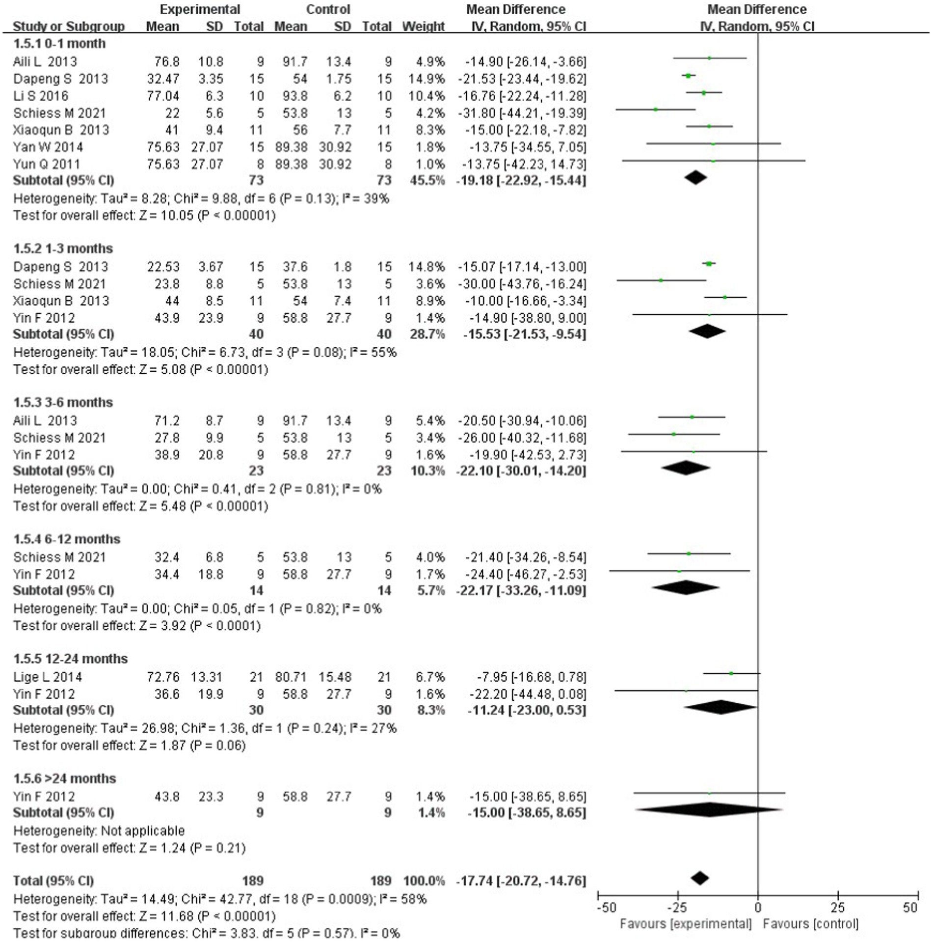 進行亞組分析以探討治療效果隨時間的變化。大多數研究證明了不同時間點的兩到三個終點:干預后0-1個月有效,1-3干預后幾個月有效,干預后3-6個月有效,干預后6-12個月有效,干預后12-24個月有效;只有一項試驗在24個月后顯示結果,并報告干細胞移植無效。亞組之間存在顯著差異;因此,干細胞移植在干預后至少12個月內有效(圖5)。