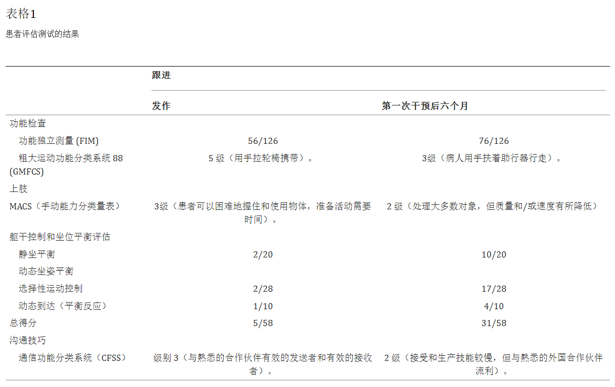 治療前后對患者進行FIM(功能獨立測量)、GMFCS(粗大運動功能分類系統88)、Tardieu量表、TCMS(軀干控制測量量表)、MACS(手動能力分類量表)、CFSS進行隨訪(通信功能分類系統)18個月并接受強化康復。