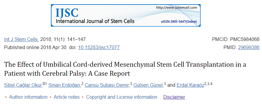 2018年,土耳其伊斯坦布爾麗芙醫院再生醫學和干細胞制造中心一項病例報告中,調查臍帶間充質干細胞移植治療腦癱兒童的安全性和有效性。