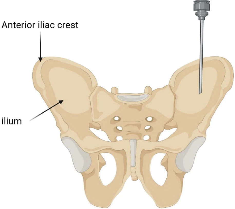 BMMNC采集流程:全身麻醉下于手術(shù)室行雙側(cè)髂前上棘骨髓抽吸(圖2)。