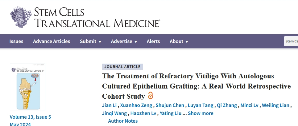 [2]Jian Li, Xuanhao Zeng, Shujun Chen, Luyan Tang, Qi Zhang, Minzi Lv, Weiling Lian, Jinqi Wang, Haozhen Lv, Yating Liu, Jiayi Shen, Taro Uyama, Fuyue Wu, Jinfeng Wu, Jinhua Xu, The Treatment of Refractory Vitiligo With Autologous Cultured Epithelium Grafting: A Real-World Retrospective Cohort Study,?Stem Cells Translational Medicine, Volume 13, Issue 5, May 2024, Pages 415–424,?https://doi.org/10.1093/stcltm/szae009