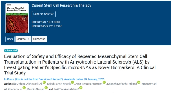 [1]Zahraa Alkhazaali-Ali et al.Evaluation of Safety and Efficacy of Repeated Mesenchymal Stem Cell Transplantation in Patients with Amyotrophic Lateral Sclerosis (ALS) by Investigating Patient’s Specific microRNAs as Novel Biomarkers: A Clinical Trial Study.DOI: 10.2174/011574888X330199250106081717.
