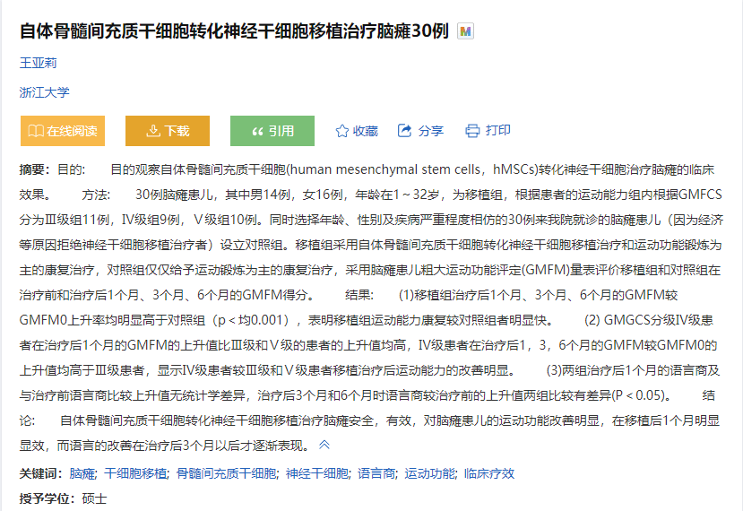 2016年,浙江大學目的觀察自體骨髓間充質干細胞(human mesenchymal stem cells,hMSCs)轉化神經干細胞治療腦癱的臨床效果。