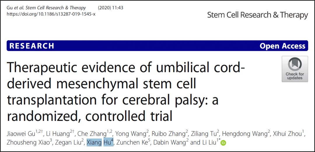 2023年2月,大連醫科大學第一附屬醫院劉晶教授在《StemCell Research &Therapy》期刊雜志上發表了一篇關于《腦癱神經干細胞鼻內給藥后的安全性和有效性結果:一項隨機1/2期對照試驗》的論文。