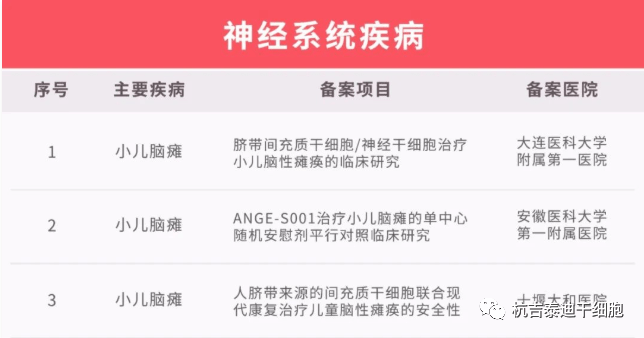2019年,由大連醫科大學附屬一院劉晶教授主持的《臍帶間充質干細胞/神經干細胞治療小兒腦性癱瘓的臨床研究》項目已經通過衛計委備案并啟動。