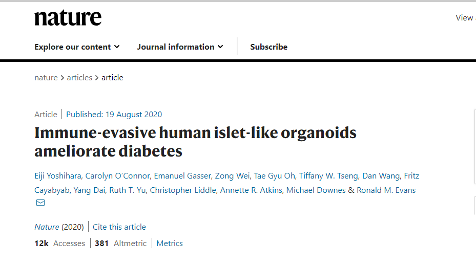 2020年8月19日,美國Salk研究人員在《Nature》上發布了一項重要研究成果:研究人員利用干細胞技術,成功制造出了第一批能夠躲避免疫系統的人類胰島素分泌胰腺細胞簇,這些“免疫保護”細胞簇一旦移植到人體內,患者無需再服用免疫抑制藥物,這為治療1型糖尿病患者帶來了新曙光