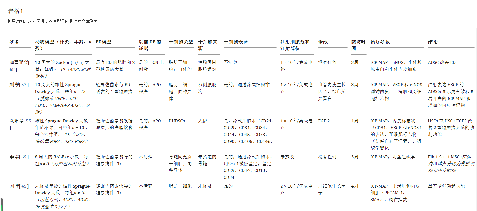 自2000年代以來,就一直在開展ED病例的干細胞研究。然而,大多數(shù)研究僅限于實驗動物。在本文回顧的 25項研究中,我們發(fā)現(xiàn)其中21項是在動物身上進行的(表1) 和四個關(guān)于人類的 (表2)。