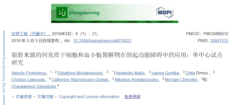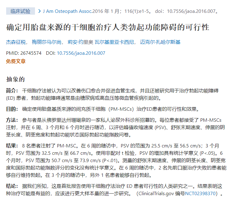 2016年,Levy等人報道了PM-SCs(胎盤基質(zhì)干細胞)在8名ED患者中的應(yīng)用。治療后6個月后,Levy等人得出結(jié)論,干細胞療法可改善勃起功能。