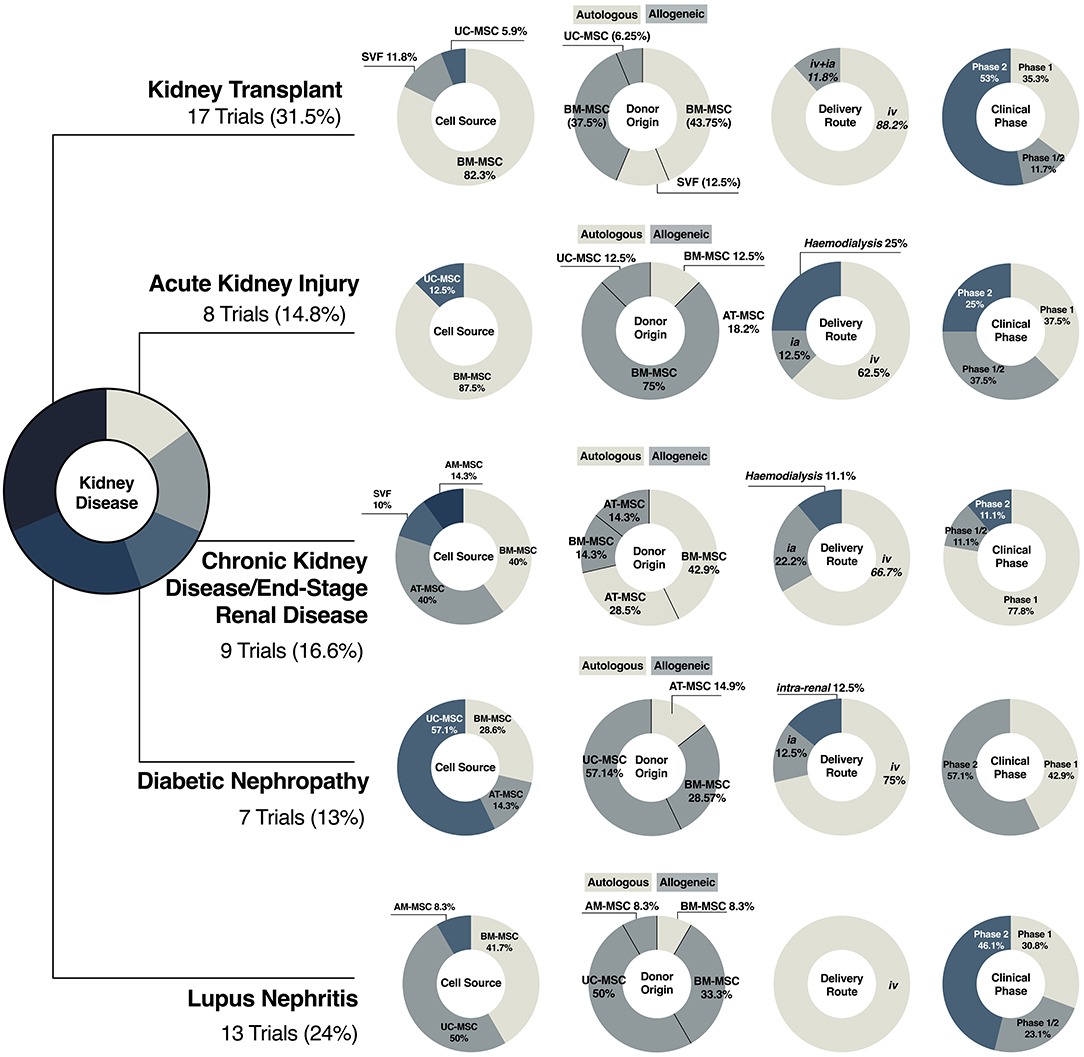 上述有希望的臨床前結(jié)果已促成早期臨床研究,這些研究旨在研究基于MSC的療法在多種腎臟病理中的安全性和有效性。