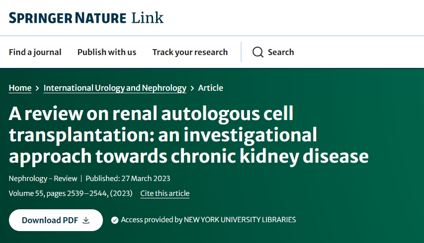 [1]:Copur, S., Yavuz, F., Covic, A.?et al.?A review on renal autologous cell transplantation: an investigational approach towards chronic kidney disease.?Int Urol Nephrol?55, 2539–2544 (2023). https://doi.org/10.1007/s11255-023-03574-5
