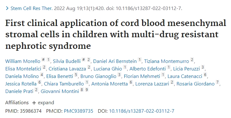 Morello, W. et al. First clinical application of cord blood mesenchymal stromal cells in children with multi-drug resistant nephrotic syndrome.?Stem Cell Res. Ther.?13, 420 (2022).