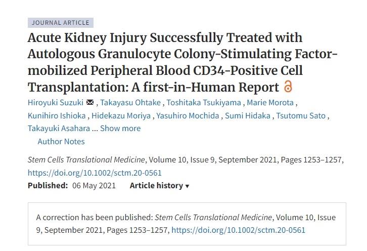 Hiroyuki Suzuki, Takayasu Ohtake, Toshitaka Tsukiyama, Marie Morota, Kunihiro Ishioka, Hidekazu Moriya, Yasuhiro Mochida, Sumi Hidaka, Tsutomu Sato, Takayuki Asahara, Shuzo Kobayashi, Acute Kidney Injury Successfully Treated with Autologous Granulocyte Colony-Stimulating Factor-mobilized Peripheral Blood CD34-Positive Cell Transplantation: A first-in-Human Report, Stem Cells Translational Medicine, Volume 10, Issue 9, September 2021, Pages 1253–1257, https://doi.org/10.1002/sctm.20-0561