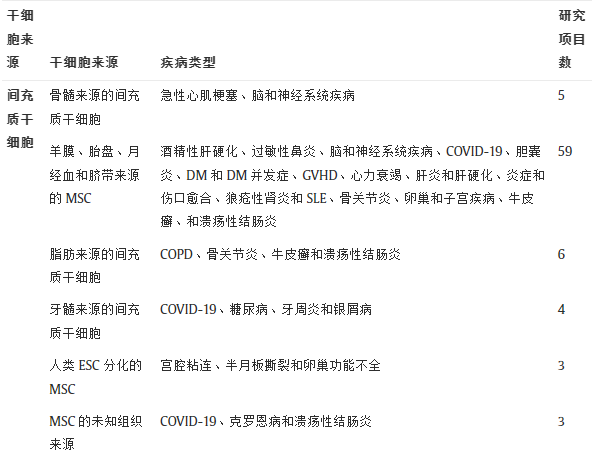 截至2021年10月,約130家三甲醫(yī)院獲國家衛(wèi)健委和國家藥監(jiān)局授權(quán)開展干細(xì)胞臨床研究。本節(jié)簡要概述了六年的搜索,迄今為止已確定了總共100個臨床研究項(xiàng)目。這些項(xiàng)目在2015年法規(guī)實(shí)施后已獲得衛(wèi)生和藥品主管部門的批準(zhǔn)。這些臨床研究項(xiàng)目的總結(jié)如表1所示。