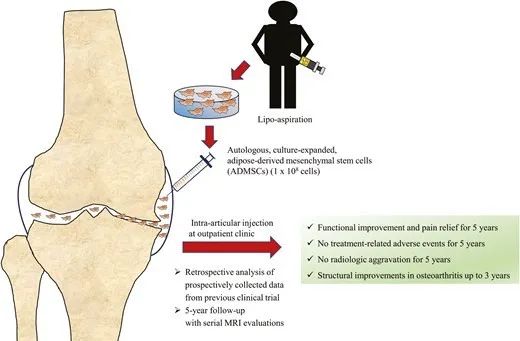 2022年7月,韓國首爾江東慶熙大學(xué)醫(yī)院發(fā)表在《Stems Cells Translational Medcine》的5年隨訪研究證實,通過向關(guān)節(jié)腔內(nèi)注射間充質(zhì)干細(xì)胞可安全有效治療膝關(guān)節(jié)骨性關(guān)節(jié)炎。研究結(jié)果發(fā)現(xiàn),經(jīng)過間充質(zhì)干細(xì)胞治療的膝骨關(guān)節(jié)炎患者在注射后6個月直至隨訪結(jié)束時,膝骨關(guān)節(jié)疼痛程度更輕且膝骨關(guān)節(jié)功能狀態(tài)更好。