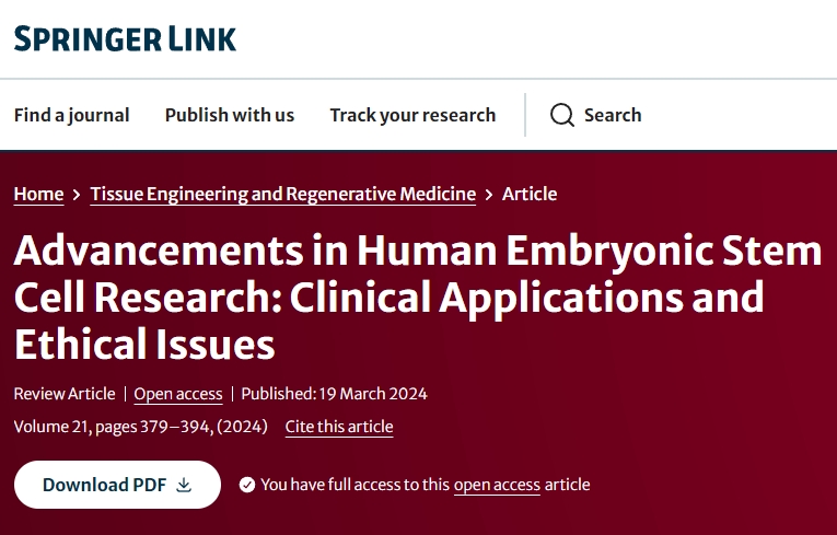 參考資料:Park SJ, Kim YY, Han JY, Kim SW, Kim H, Ku SY. Advancements in Human Embryonic Stem Cell Research: Clinical Applications and Ethical Issues. Tissue Eng Regen Med. 2024 Apr;21(3):379-394. doi: 10.1007/s13770-024-00627-3. Epub 2024 Mar 19. PMID: 38502279; PMCID: PMC10987435.