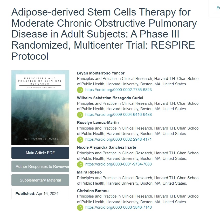 【8】Adipose-derived Stem Cells Therapy for Moderate Chronic Obstructive Pulmonary Disease in Adult Subjects: A Phase III Randomized, Multicenter Trial: RESPIRE Protocol. (2024). Principles and Practice of Clinical Research, 10(1). https://doi.org/10.21801/ppcrj.2024.101.1