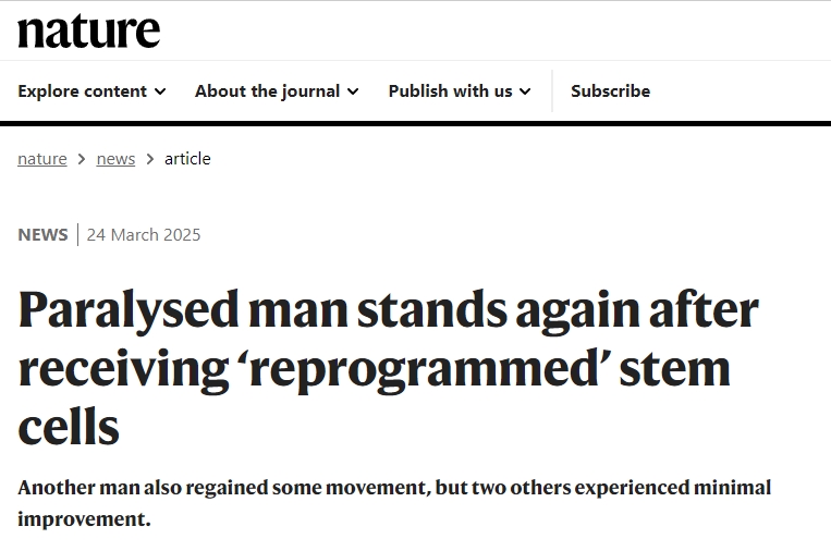 2025年3月24號,日本慶應義塾大學教授岡野秀之領導的研究小組宣布首個利用誘導多能干細胞在治療脊髓損傷方面取得重大突破。該研究結果發表在權威期刊雜志《nature》上。