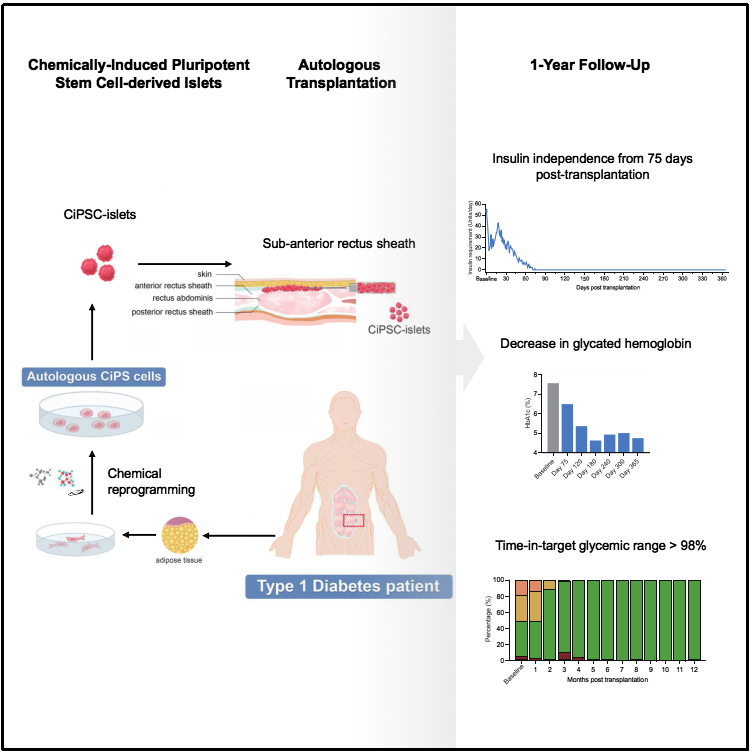 2024年9月25日,天津市第一中心醫院沈中陽、王樹森研究組聯合北京大學昌平實驗室鄧宏魁研究組在Cell發表題為“Transplantation of Chemically Induced Pluripotent Stem-Cell-Derived Islet Under Abdominal Anterior Rectus Sheath in a Type 1 Diabetes Patient”的研究論文,在國際上首次報道了利用化學重編程誘導多能干細胞制備的胰島細胞移植,治療1型糖尿病的臨床研究。