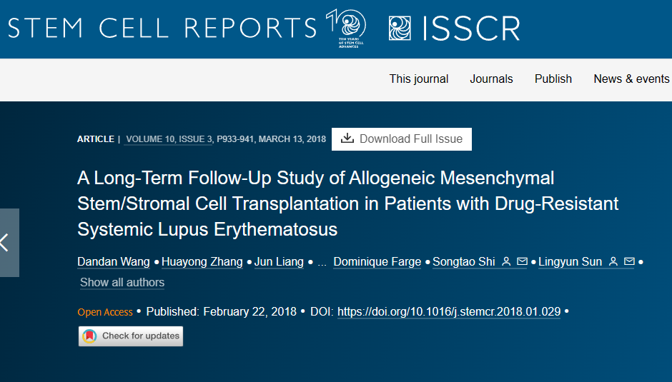 2018年,國際期刊《STEM CELL REPORTS》上刊登了關于間充質干細胞治療系統性紅斑狼瘡的臨床研究。這是一項開放標簽的II期臨床試驗,81名重度難治性系統性紅斑狼瘡患者接受異體骨髓/臍帶間充質干細胞靜脈輸注治療,并進行了平均長達5年的隨訪。
