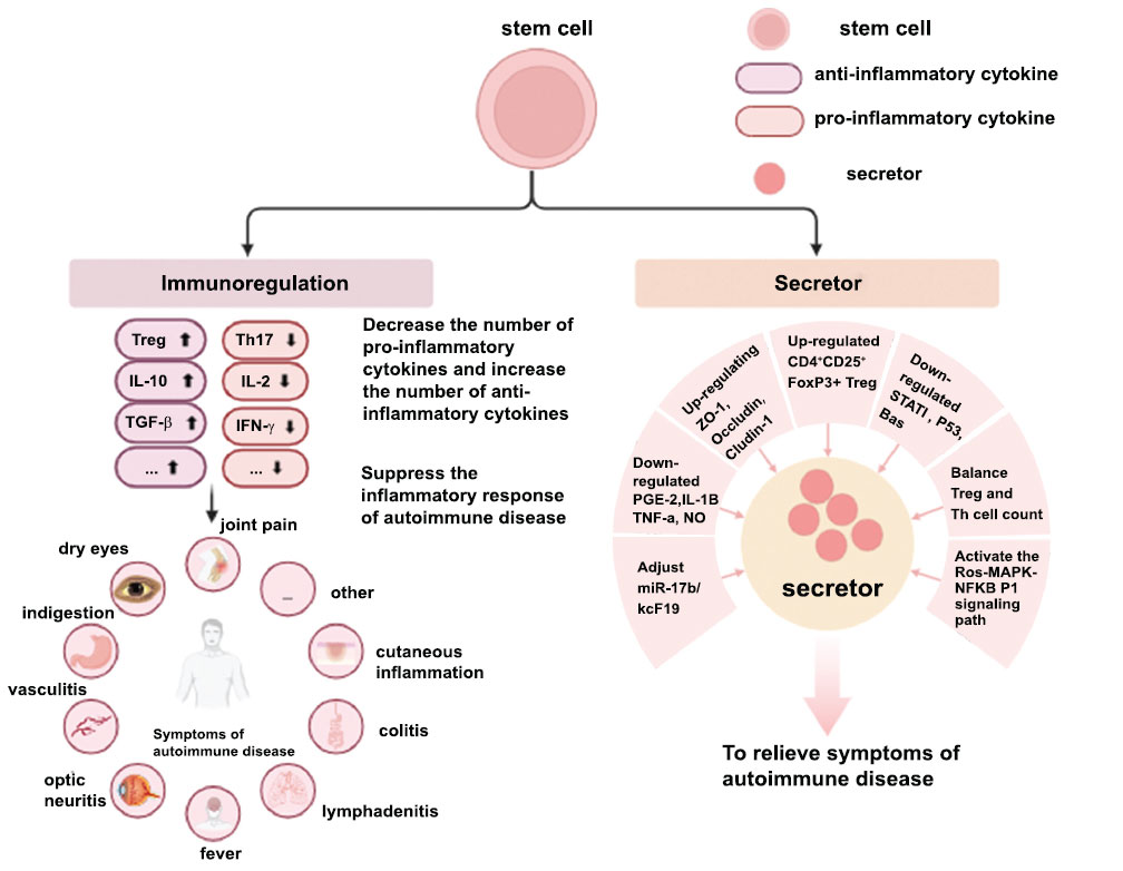 干細胞憑借其強大的自我更新和分化能力在多種疾病中發揮治療作用,尤其在自身免疫性疾病的治療中。目前,干細胞治療自身免疫性疾病的機制主要依賴于其免疫調節能力,調節患者體內輔助細胞、抗炎因子和促炎因子的數量和功能,從而減輕炎癥。另一方面,干細胞來源的分泌體免疫原性弱、分子量小,能夠靶向損傷部位,與復合材料結合后可以延長其在患者體內的作用時間。因此,分泌體在干細胞治療自身免疫性疾病中的作用日益重要。