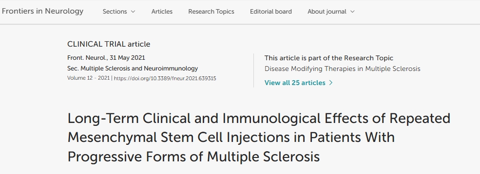 2021年,“神經(jīng)病學前沿”雜志子刊“多發(fā)性硬化癥和神經(jīng)免疫學”發(fā)表了一篇“間充質(zhì)干細胞重復注射對進展型多發(fā)性硬化癥患者的長期臨床和免疫學影響”的研究文章。