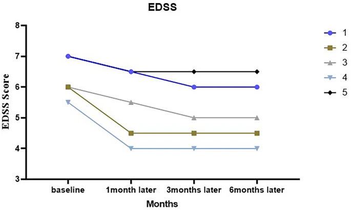 EDSS在細(xì)胞注射后第一個(gè)月下降,兩名患者在第三個(gè)月呈下降趨勢,其余患者則保持不變(圖2)。表S1描述了注射前三年和注射MSCs后一年的EDSS變化。