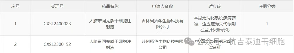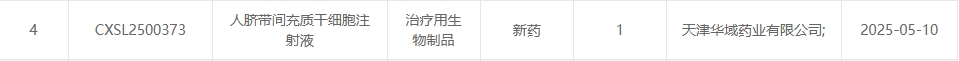 新增受理11:2025年05月10號,天津華域藥業有限公司的人臍帶間充質干細胞注射液的臨床試驗申請獲受理(受理號:CXSL2500373)。這是該款細胞注射液1獲得受理。