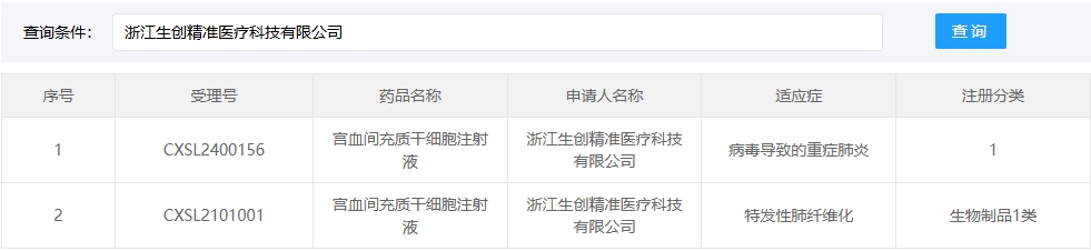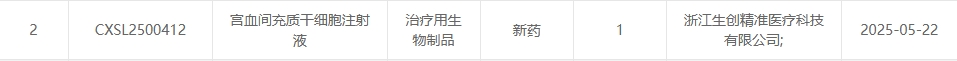 新增受理13:2025年05月22號,浙江生創精準醫療科技有限公司的宮血間充質干細胞注射液的臨床試驗申請獲受理(受理號:CXSL2500412)。這是該款細胞注射液3獲得受理。