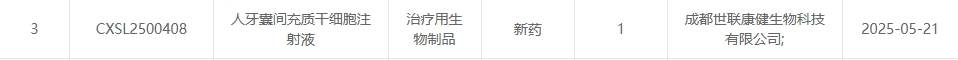 新增受理12:2025年05月21號,成都世聯康健生物科技有限公司的人牙囊間充質干細胞注射液的臨床試驗申請獲受理(受理號:CXSL2500408)。這是該款細胞注射液第1次獲得受理。