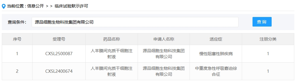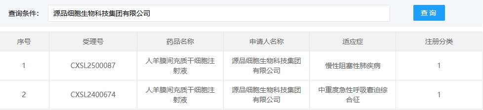 新增受理3:2025年1月27號,源品細胞生物科技集團有限公司的人羊膜間充質干細胞注射液的臨床試驗申請獲受理(受理號:CXSL2500087)。這是該款細胞注射液第2次獲得受理,適應癥:慢性阻塞性肺疾病。