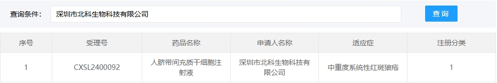 新增受理10:2025年05月01號,深圳市北科生物科技有限公司的人臍帶間充質干細胞注射液的臨床試驗申請獲受理(受理號:CXSL2400092)。這是該款細胞注射液1獲得受理。適應癥:中重度系統性紅斑狼瘡
