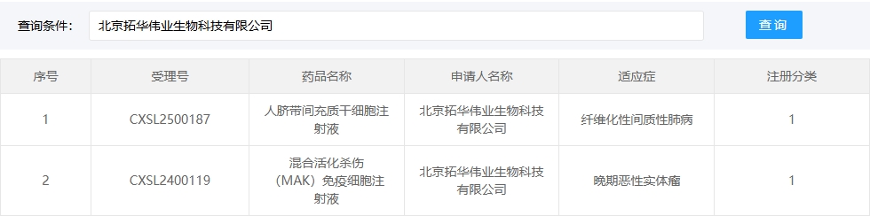 新增受理7:2025年02月28號,北京拓華偉業生物科技有限公司的人臍帶間充質干細胞注射液的臨床試驗申請獲受理(受理號:CXSL2500187)。適應癥:纖維化性間質性肺病。